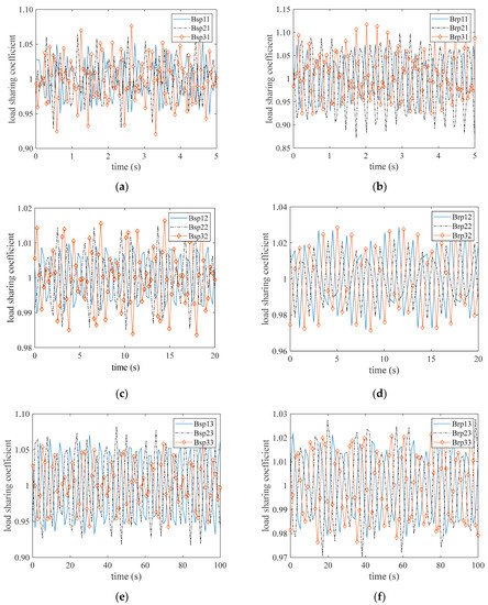 The load sharing coefficients of the internal and external meshing in three stages calculated based on the model above are shown in Figure 4a–f, respectively. The dynamic load sharing coefficients vary periodically with the gears operation. In the first stage, the dynamic load sharing coefficient Bsp1 of the external meshing is 1.076 and Brp1 of the internal meshing is 1.116. Then, Bsp2 of the external meshing is 1.016 and Brp2 of the internal meshing is 1.028 in the second stage. Moreover, the dynamic load sharing coefficient Bsp3 is 1.092 and Brp3 of the internal meshing is 1.027 in the third stage.