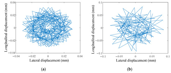 The sun gear deviates from the original position with fluctuation. As the sun gear in the first stage of the pitch drive of wind turbines is radially fixed, it cannot float. As a consequence, only the floating displacement of sun gears in the second and third stage is researched in this study. The longitudinal and lateral floating displacements in the second and third stage are shown in Figure 5a,b, respectively. The radial synthetic floating displacement of the sun gear is 0.028 mm in the second stage and 0.087 mm in the third stage.