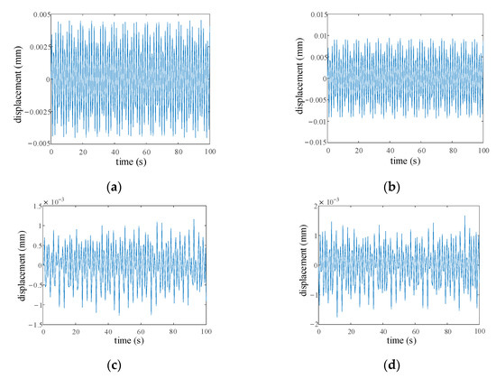 In order to analyze displacement under different loads, the displacement of the carrier in the third stage under 50% and 150% rated torque are also calculated in the time-domain. The vertical displacement Yc3 of the carrier in the third stage under 50% and 150% rated torque are shown in Figure 9a,b, respectively. In addition, the vertical displacement Yc3 of the carrier under the rated torque is shown in Figure 8c. It can be seen from these figures that the displacement of the carrier improves slowly with the load increment.