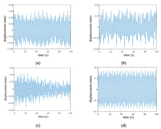 The time-domain displacement of each component in each stage is analyzed in this section. The time-domain displacement of the components in certain directions in the first, second and third stage are shown in Figure 6, Figure 7 and Figure 8, respectively. Owing to the rotation torque in every stage, the rotational displacement of the planetary gear is larger than its radial displacement. Additionally, the displacement of the sun gear, the planetary gear and the carrier in the third stage is greater than that in the first and second stages, on account of the largest torque in the third stage.