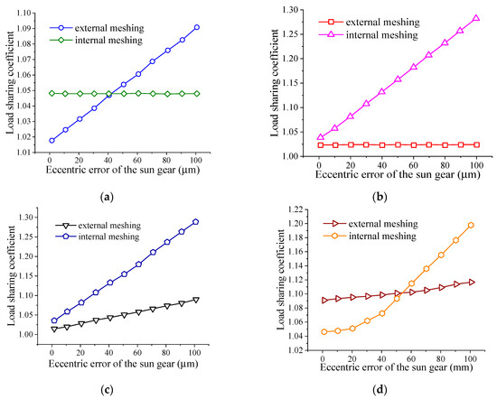 With eccentric error increment of the sun gear, the load sharing coefficient of the external meshing augments significantly. The load sharing coefficient of the internal meshing remains unchanged because the sun gear does not get incorporated into the internal meshing. Similar to the sun gear, the eccentric error of the ring gear has an obvious effect on the internal meshing, as shown in Figure 11a,b.