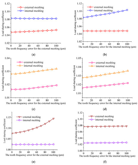 The impact of the tooth frequency error on the load sharing coefficient of the external and internal meshing in three stages is shown in Figure 12a–f. In the first stage, the dynamic load sharing coefficient of the external meshing increases slowly with an augment in the tooth frequency error of the external meshing, while that of the internal meshing remains unchanged. When the tooth frequency error of the internal meshing grows, the dynamic load sharing coefficient of the internal meshing also improves significantly, while that of the external meshing is basically unchanged, as shown in Figure 12a,b. The influence of the tooth frequency error in the second stage is shown in Figure 12c,d. Both the load sharing coefficients of the external and internal meshing promote gradually as the tooth frequency error augments.