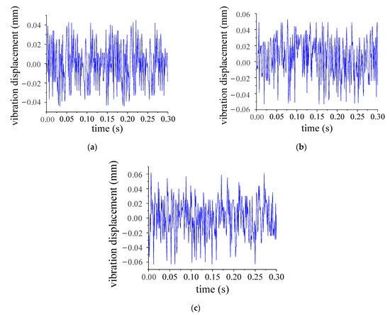 Furthermore, a uniaxial vibration sensor is mounted on the output shaft housing of the tested gearbox through magnetic attraction. The vibration sensor is Vib 90 with a 1000 Hz frequency response; it tests the radial acceleration signal of the output shaft. A signal processor inside the vibration sensor can calculate the velocity and displacement according to the vibration signal automatically, and then output the vibration data in the time domain. In addition, a data acquisition card is installed in the control cabinet. All the data are collected using LabView software and then displayed on the screen of the control cabinet, as shown in Figure 14b. Moreover, the vibration displacements of the gearbox are tested under three types of load: 50% rated torque, 100% rated torque and 150% rated torque.