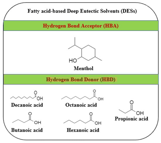 Chemical compositions of different fatty acids (decanoic acid, butanoic acid, octanoic acid, hexanoic acid, and propionic acid) as the hydrogen bond donors required to synthesize hydrophobic deep eutectic solvents (DESs) with menthol (hydrogen bond acceptor).