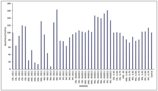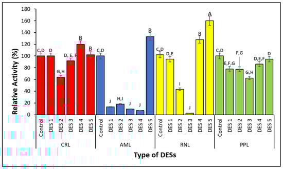 Lipase from PPL demonstrated a lower relative activity compared to the control (free lipase) when activated with different types of hydrophobic DESs (DES1–DES5). On the other hand, DES 3 caused a severe loss of activity in both AML and RNL, where only AML was negatively affected by DES 4 and RNL in DES 3. In DES 3, the CRL activity was seen to slightly decrease (an approximate 10% reduction in activity), whereas 38% of the activity was lost in DES2.