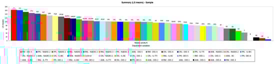 The relative activities of lipases were assessed in different solvents based on the statistical analyses. Figure 4 depicts the relative lipase activity of the solvents and co-solvents used. The AML@DES-5 has the significantly (p < 0.05) highest lipase activity, followed by RNI-DES 4 and RNI-DES 5. The ranking of lipase activity as affected by the solvents and co-solvents is as follows: AML-DES 5 > RNL-DES 4 > RNI-DES 5 > PPL-NADES 2 > RNI-DES 1, where the lipase activity of these solvents and co-solvents was significantly different (p < 0.05). Figure 5 arranges the solvents and co-solvents into decreasing ranking indicators: from the highest lipase activity to the lowest lipase activity by computing the least (LS) means of the lipase activity. The RNL-DES 5, PPL-NADES 2, and PPL-NADES 1, which had the highest lipase activities with insignificant differences of means, were the most suitable reaction media, while AML-DES 3, AML-DES 4, and RNL-DES 3 were the least suitable reaction media for hydrolysis in this study.
