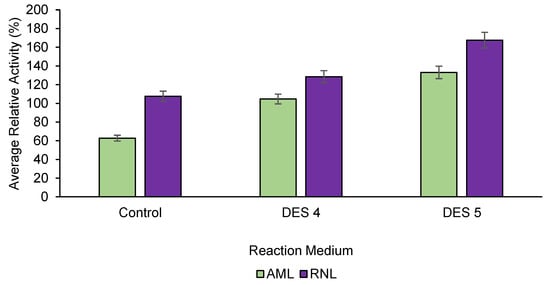 Based on this analysis, we examined both RNL and AML with DES 4 and 5 to validate the statistical findings. The results can be seen in Figure 6, where the data revealed that RNL in DES 5 as a reaction medium shows outstanding performance in terms of enhancing lipase activity; hence, it was selected as the study case.