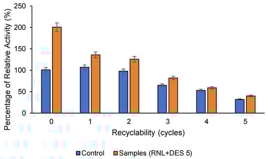 Recyclability of RNL (control) and RNL@DES-5 (sample). DES5 = menthol:decanoic acid (1:1) and RNL = Rhizopus niveus lipase. Conditions: concentration of lipase: 1 mg mL−1, 2 h, 300 rpm, 40 °C, and pH 7.0.