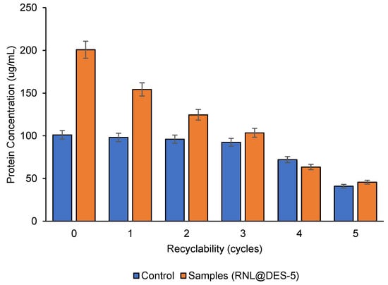 Total protein recyclability of RNL (control) and RNL@DES-5 (sample). DES5 = menthol:decanoic acid (1:1) and RNL = Rhizopus niveus lipase. Conditions: concentration of lipase: 1 mg mL−1, 2 h, 300 rpm, 40 °C, and pH 7.0.