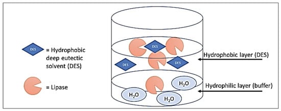 Illustration of lipase molecules’ predicted behavior in a medium containing a hydrophobic layer (DES) and a buffer solution (in water).