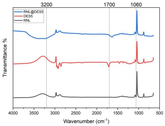 The vibration of the S=O stretching gives rise to an intense stretching peak normally found between 1065 and 1061 cm−1. The S=O stretching is most likely caused by the DES components’ robust intramolecular interactions [51]. Additionally, the bending of the C=C band at 991 and 842 cm−1 of DES 5 demonstrates that DES 5 was successfully activated with RNL.