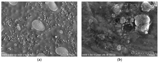 The surface morphology of the free and enhanced lipase was observed under scanning electron microscopy (SEM). The RNL morphology as the control (a) and RNL@DES-5 (b) are shown in Figure 11, with 10k and 40k magnification, respectively. The SEM images of lipase molecules (RNL) as the control and RNL@DES-5 were examined; it was seen that polygonal granules are formed in the RNL morphology. Unlike the control (RNL), the SEM image revealed that the lipase molecules (RNL) were activated with DES-5, as it demonstrates a cloud-like appearance upon the introduction of DES 5. The figure shows that some of the enzyme clumps tend to adhere to the lipase molecules. According to Cao et al. [52], it has been widely accepted that the almost hydrophobic DESs have a significant impact on the activity and structure of enzymes. In a study reported by Guajardo et al. [53], the activated lipases in cross-linked aggregates (CLEA) generate an effective biocatalyst that is extremely stable in non-traditional, low-viscous DESs. Consequently, the FTIR results were supported by the morphology of the activated lipase (RNL@DES-5) from the SEM images. On the other hand, enhancing the enzymatic activity and behavior of enzyme immobilization will be greatly aided by the changes in the structure of lipases that result from immobilization.