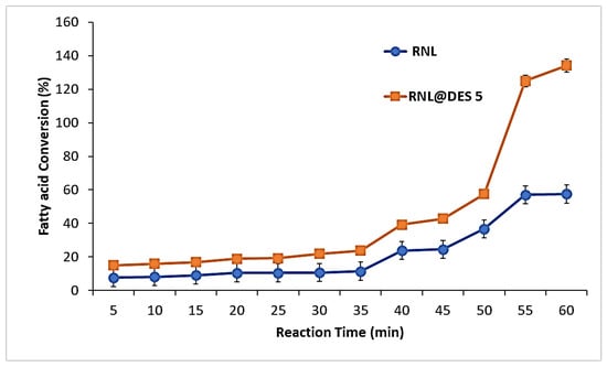 To illustrate the possibility of DES as a medium for ester synthesis, RNL was evaluated for its ability to synthesize esters in the presence of hexane and DES5. The result showed that the RNL@DES5 was able to catalyze the synthesis of ethyl decanoate (Figure 12). The results demonstrated that esterification occurs at 40 min. The free fatty acid conversion in the DES5 medium reached 78%, which is higher than the organic medium (58%) after 60 min.