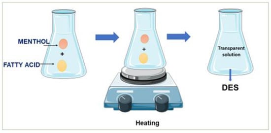 To synthesize DESs with a 1:1 molar ratio, a specific amount of menthol and several fatty acids (decanoic acid, propionic acid, hexanoic acid, butanoic acid, and octanoic acid) were combined. Figure 13 demonstrates the procedure to synthesize hydrophobic deep eutectic solvents (DESs) using menthol as a hydrogen bond acceptor and fatty acids as hydrogen bond donors. The molar ratio was designated based on the literature by Tang et al. [54]. Each DES was synthesized by placing the required components into a glass flask that was completely sealed and heated without stirring for four hours at 70 °C. It was expected that an effective DES would be formed by a homogeneous and transparent liquid. Prior to storage, the mixture was cooled to room temperature.