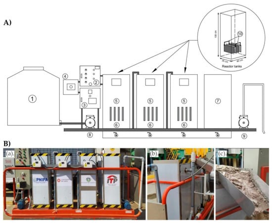 (A): Scheme of the electrocoagulation pilot plant. (1) Equalizer tank. (2) Control board. (3) Power source. (4) Voltage variator. (5) Reactor tanks. (6) Aluminum electrodes. (7) Clarifying tank. (8) Charging pump. (9) Discharge pump. (10) Cable connection. (B): Electrocoagulation pilot plant images. (a) Image of front. (b) Back image. (c) Sludge collector.
