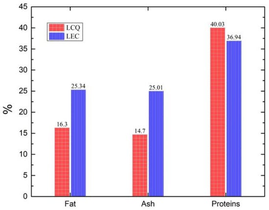 There is evidence of a higher percentage of fat and ash content in the LEC samples; consequently, there is a percentage decrease in the protein content (Figure 3). The average results of LCQ versus LEC were 16.3 ± 4.7% and 25.3 ± 1.2% in fat; 14.7 ± 1.4% and 25.01 ± 2.2% in ash; and 40.0 ± 3.4% and 36.9 ± 2.2% in protein.