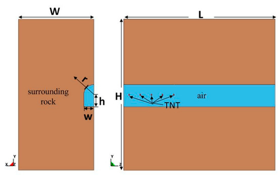 The physical model adopted in this paper is shown in Figure 2 and Figure 3. In order to make rational use of computing resources, a 1/4 model was adopted for calculation. Symmetric boundaries were set on the Y-Z plane and X-Y plane. The model was divided into surrounding rock, air, and TNT explosive. Among them, the TNT was divided into 5 parts and was evenly distributed on the roadway axis, which was 1.2 m away from the roadway bottom. The coordinates of the initiation point were (0, 0, 0.5). To eliminate the boundary effect, the length, width, and height of the calculation model were 15 m, 7.5 m, and 15 m, respectively. The cross-section of the underground roadway was generally arched. In this numerical simulation, it was assumed that the roadway height is 2 m, the width is 2 m, and the crown radius is 1 m.