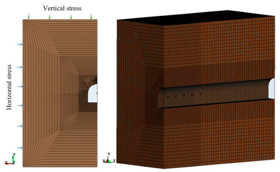 In order to make the simulation results conform to real roadway cases, boundary conditions were set around the model. To reduce the boundary reflection effect, a non-reflection boundary was set at the top, both sides, and rear of the model. In order to prevent unreasonable displacement and deformation of the model in the Y direction under the gravity effect, a rigid boundary was set at the bottom of the model. The symmetrical boundary was set on the Y-Z plane and X-Y plane.