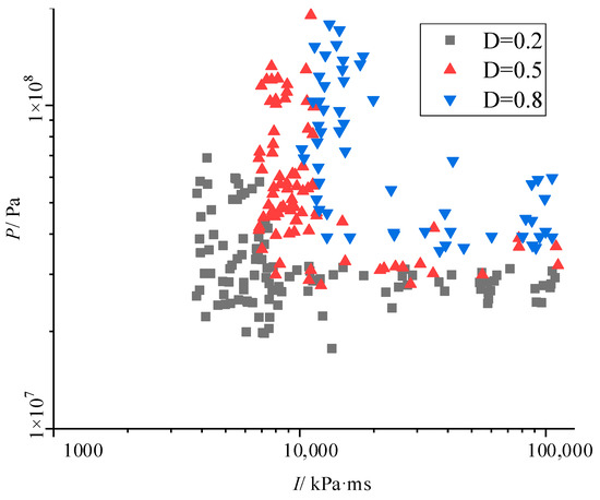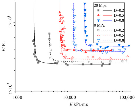 The P-I curves of the roadway wall under the conditions with geostress of 0 MPa and 20 MPa were compared, and the results are shown in Figure 9. It can be seen from Figure 9 that the distribution of the P-I curve on the roadway wall is denser without geostress. The three overpressure asymptotes are between the two damage grades of D = 0.2 and D = 0.5 on the roadway wall after geostress loading, and the impulse asymptote distribution is also denser. The density distribution of the overpressure asymptote changes after loading the geostress. The overpressure asymptote with D = 0.2 is lower, and the roadway wall damage at this grade is more likely to occur, while the overpressure asymptote with D = 0.5 and D = 0.8 is more upward. The reason is that the geostress load causes certain initial damage to the roadway wall before the explosion, so roadway wall damage of a low grade is more likely to occur. However, the critical value of explosion overpressure required to make the roadway wall reach severe damage is higher because the geostress has a blocking effect on the propagation of the explosion stress wave. After the geostress is loaded, the impulse asymptotes of the D = 0.5 damage grade are very close to each other, and the difference in I0 is not large, but the distribution of the other two impulse asymptotes is more dispersed. The growth rates of I0 are 14,399 39,839, which are 1.6 times and 2.6 times the growth rate of I0 without geostress.