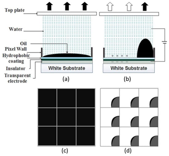 The EWD pixel structure and display principle [17] are shown in Figure 1. An EWD pixel is composed of a transparent electrode, an insulator layer, a hydrophobic layer, a colored oil layer, water, and a hydrophilic grid (as a pixel wall).