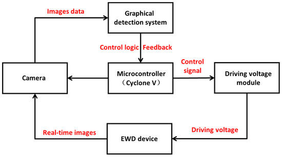The 3D schematic diagram of the drive and detection scheme for EWD is shown in Figure 3. The dynamic drive and detection scheme for EWD proposed in this paper consists of the EWD device: a low-cost camera (Resolution: , FPS: 30, pixel size: , interface: GigE), computer and graphical detection system, and portable driving control system. Figure 4 gives the block diagram of the detection and feedback mechanism.