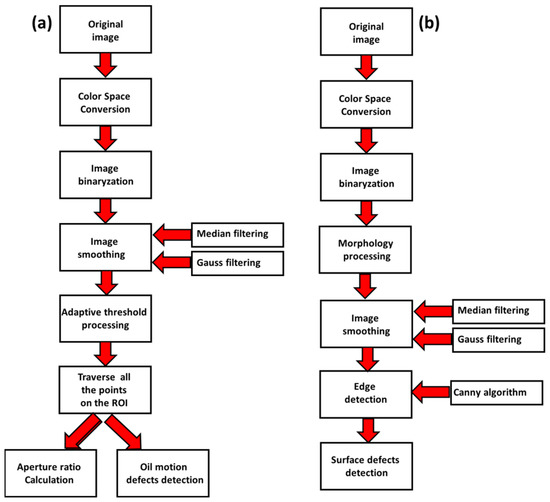 The complete image processing and analysis solutions for (a) Oil motion performance detection, (b) Surface defects detection.