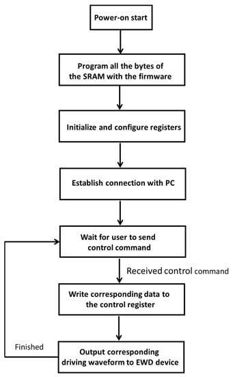 The workflow of the driving control system is given in Figure 8. First of all, the system programs all the bytes of the SRAM with the firmware after power-on. All of the driver and communication-related registers are initialized and configured. Then, the driving control system establishes a connection with the EWD detection system on the PC.