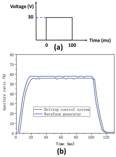 In this section, we compared our driving control system with a standard waveform generator. Both of them generate the same driving waveform (shown in Figure 9a) on the same EWD device. The microscope with the CCD camera is used to analyze the display results manually. The experimental results (Figure 9b) show that the output error of the proposed scheme is about 3 ms in the open state of the EWD device. The reason for this is that it takes time for the control core to output the data signal to the driver chip. Additionally, the generation of corresponding high voltage has a preparation stage. In addition, the difference between them is only about 1 ms in the close state of the EWD device. Overall, the error of both of them (the proposed scheme and waveform generator) is less than 5%.