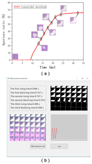 In this section, we use the proposed scheme to detect the aperture ratio of an EWD pixel unit from the closed state to the fully open state. This experimental purpose verifies the real-time, and reliability of the proposed scheme. In this experiment, we observed and recorded the oil movement state in the EWD pixel unit by the proposed scheme. The screenshot of the EWD detection system is shown in Figure 10b. The detection result is shown in Figure 10a. To reduce the oil-splitting phenomenon, a sinusoidal waveform was used for the EWD driving waveform. From this experiment, we can see that the aperture ratio of the EWD pixel began to rise from 0% with the increasing external applied voltage. When the externally applied voltage reaches a certain threshold, the oil covered on the surface starts to shrink (starting at about 9 ms). After that, the oil movement starts to become faster. Then, the aperture ratio increases rapidly. Almost all the oil shrinks in the upper left corner of the pixel at 32 ms. Oil splitting does not occur under this driving waveform because the oil has enough time to rearrange. It can be seen that the maximum aperture ratio of this EWD device, as shown in Figure 10a, reached about 65%.