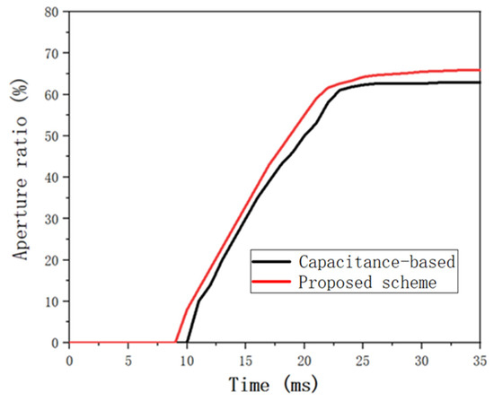 To verify the accuracy of the proposed scheme, we used the capacitance-based EWD detection system developed by our team previously [15] for comparison. The capacitance-based EWD detection method has been proven to be effective and feasible by previous experiments. Both schemes are used to detect the same pixel of an EWD device. The comparison result is shown in Figure 12. It can be seen that the red curve agrees with the black curve in general. The error rate between them is within 6%.