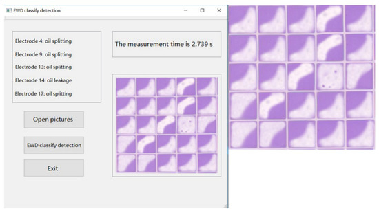 Due to the immature manufacturing technology, scratch defects (as shown in Figure 14b) are commonly found in EWD devices. Scratch defects are a kind of irreparable defects. It has no fixed shape, and its main image feature is black. Hence, to reduce the interference of oil motion, the proposed scheme detected scratch defects at the reset stage. The scratch detection results are displayed in the GUI (as shown in Figure 14a). In addition, the system records the defective pixel numbers and saves them to the specified directory. Users can query the previous detection results in the history option.