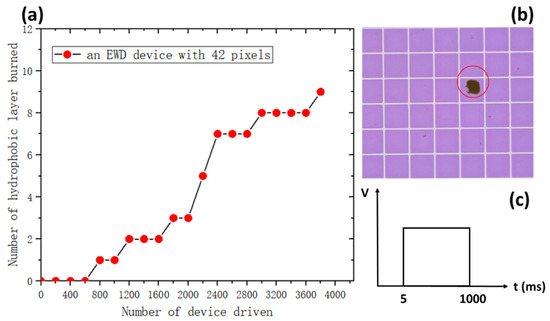 (a) Variation curves of the hydrophobic layer of a EWD device with 42 pixels, (b) Image of burned hydrophobic layer, (c) Driving waveform used in this experiment.