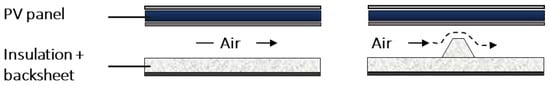 Air-based PVT geometry is considered simpler than liquid-based PVT panels, since the sealing is recommended but is not considered as mandatory. The air path through the panel is key to determining the heat transmission, the pressure drop of the system, and the maximum flow rate. Regarding geometry, double-pass absorbers are considered to be more thermally efficient than single-pass ones, but they also bring more complexity and a higher pressure drop. In this regard, Hegazy [8] presented a comparison between four air PVT collectors, concluding that double single-pass was the most suitable design for solar exploitation. Higher thermal efficiency values were found to rise up to 71–83% and correspond to double-pass collectors, without PV generation.
