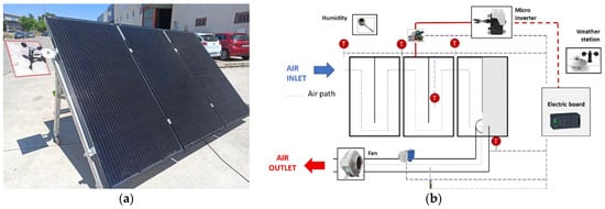 Testing bench of air-based PVT panels: (a) Frontal view of real set-up; (b) Scheme of set-up with main equipment and sensors.