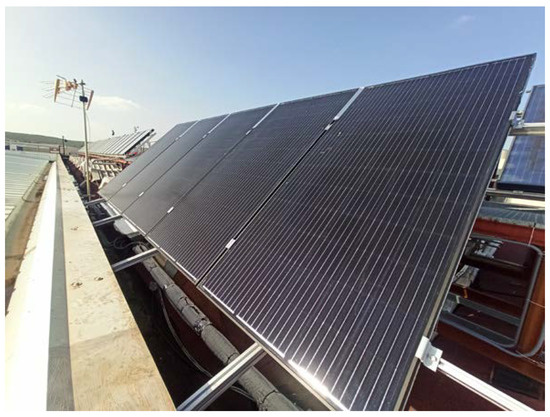 The experimental testing rig of the prototypes was constructed following the indications of the standard ISO 9806:2017—Solar energy. Solar thermal collectors. Test methods [36]. The testing bench was designed for three panels, in order to be able to evaluate not only the performance of one isolated panel but also the combination of two or three in a row, to obtain higher output temperatures. The scheme of the final setup is shown in Figure 2.