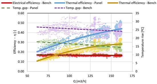 As stated before, the fluid flow rate has a strong influence on the values obtained. In order to evaluate the influence of the other variables, those have been assessed by defining similar flow rate groups. To that end, we have grouped the efficiency values of the first panel for flows around 80, 100, 135, and 155 m3/h. Electrical results are shown all together, due to the lower influence.