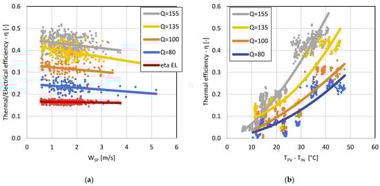 Thermal and electrical efficiency of individual panel grouped at different fluid flow levels (Q in m3/h) versus: (a) external wind speed and (b) maximum temperature gain (TPV–TIN).