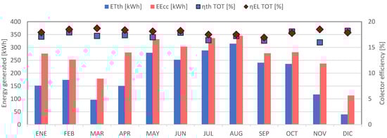 Energy production showed a great difference depending on the season, due to the strong relation to the solar resource. Electrical production showed a generation profile very similar to solar radiation, with maximum and minimum values in August (345 kWh) and December (113 kWh), respectively. Thermal production, on the other hand, depends not only on the solar radiation but also on the fan operation. In heating mode (October to April), the fan is activated only when the solar field can contribute to the heating, that is, when heat is produced over 30 °C. In dissipation mode (May to September), the fan is activated when the system is able to produce heat, which means when heat is produced over the ambient temperature. As a result, the fan operates during more hours. Consequently, the difference between summer and winter thermal energy production is higher, with extreme values again in August (315 kWh) and December (40 kWh).