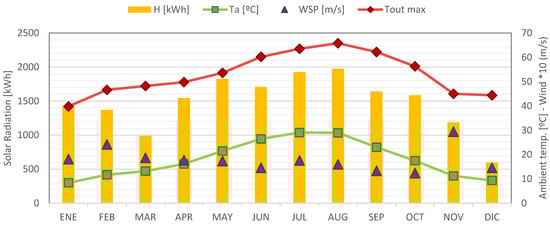 The PVT pilot plant is performed during a complete year to supply heat and electricity to an office. The installation runs with an almost constant fluid flow of 185 m3/h, which means 92.5 m3/h per line. Monthly results in terms of energy generation and efficiencies are shown in Figure 6 with the environmental conditions shown in Figure 7.