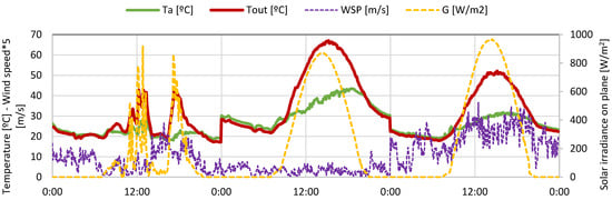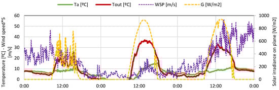 During sunny days, the perspective is very different. The period of electrical generation is still longer than the thermal operation, but remains much more similar. The thermal and electrical efficiencies along the day keep quite constant around 17–19%. The expected output temperature during peak sun hours on sunny days is in the range of 30–38 °C. At the end of the day when the ambient temperature and solar irradiance decrease, the electrical performance slightly increases due to the reduction of cell temperature, while the thermal contribution decreases. On a windy day, the wind removes the heat from the frontal face of the panel and the thermal side of the installation is strongly penalized. As a consequence, the fan starts to operate later (so the daily energy produced is lower); the thermal efficiency changes from 17.5 to 13.5% and the outlet temperature decreases a maximum of 10 degrees.