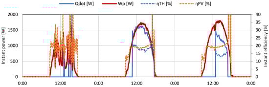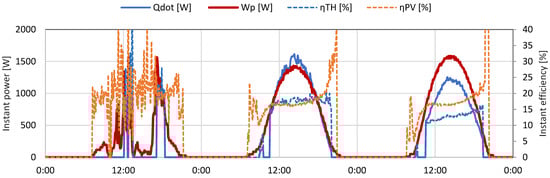 Figure 8 shows the detailed operation of a cloudy day (first), clear day with low wind level (second), and clear windy day (third). Figure 9 shows the instant energy and efficiency data for these particular days. On a cloudy winter day, the PV laminate is able to generate electricity during almost the whole period with sun radiation, following the irregular profile of the sun irradiance. The thermal part, however, is only activated when the PVT outlet temperature exceeds the inner temperature in the building, which in winter cloudy days is scarce. As a general rule, it has been observed that the fan is only activated when the solar radiation is above 500–550 W/m2.