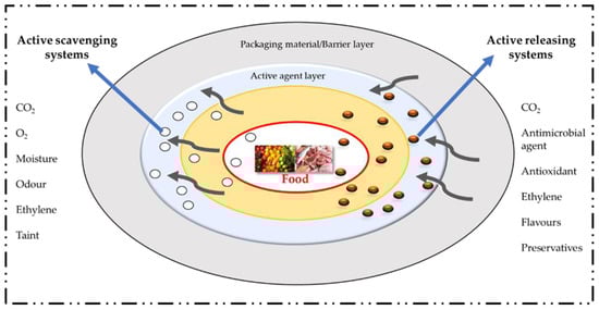 Active packaging can be described as a form of packaging in which the package, the product, and the environment interact to extend shelf life or enhance safety or sensory attributes while preserving product quality [21,22,23,24]. This is especially significant in fresh and extended shelf life foods. Food shelf life is “the period during which a food retains acceptable characteristics of flavor, colour, aroma, texture, nutritional value, and safety, under defined environmental conditions” [10]. According to Anwar and Warsiki [20], active packaging is designed to detect changes in the internal environment and respond by altering the package’s characteristics to prolong the shelf life of foods. That is, active packaging design involves incorporating active substances intended to be released into the food or absorbed into or from the packed food or the environment surrounding the food (Figure 1) [15,24,25,26]. Hence, active packaging can be grouped into active scavenging systems (absorbers) and active-releasing systems (emitters). While absorbers remove undesirable substances such as moisture, carbon dioxide, oxygen, ethylene, UV light, etc., from food or the environment, emitters add substances such as antimicrobial compounds, carbon dioxide, antioxidants, and flavors to packed food or the headspace [25,27]. An overview of the active packaging grouping is shown in Figure 1. These active packaging systems can be prepared by incorporation, coating, immobilization, or surface modification onto the packaging materials [28].