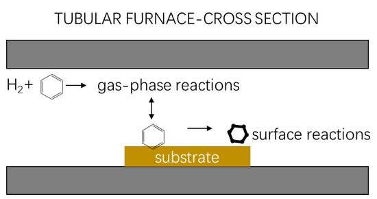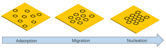 In addition, benzene rings [15,35] as carbon sources have repeatedly been shown to generate graphene via CVD at a low temperature (300~600 °C). Moreover, experiments have shown that in the composition of the gas phase in this interval, almost no breakage of the benzene ring to form small molecules occurred. The small number of small molecules of gas produced by the benzene ring in Table 2 at lower temperatures (300~600 °C), although only at the ppm level under hydrogen atmosphere, causes these small molecules of gas to be difficult to ignore because graphene is a nanomaterial and the number of atoms of carbon required for synthesis is very small. For this reason, we passed ppm levels of alkanes (C1~C3) in the experimental reactor and found that no graphene was produced under low-temperature (300~600 °C) conditions. So, we believe that graphene was synthesized mainly from benzene as the basic unit, and Figure 2 proposes a conjecture of the process of the benzene ring forming graphene on the surface of copper substrates in the reaction temperature interval of 300~600 °C.