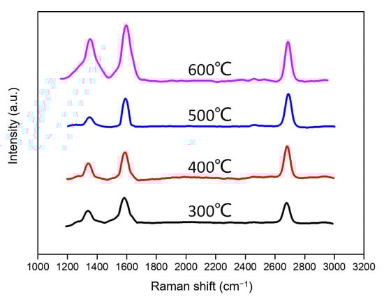 We first tried to deposit graphene on the surface of copper foil using benzene as the carbon source in order to determine the ideal conditions for the low-temperature development of graphene from coal tar. As shown in Figure 6, the Raman spectrum of graphene grown by benzene in the temperature range of 300~600 °C is shown. In the following, we choose the ideal working conditions for the low-temperature development of benzene using the parameters of each graphene peak from the Raman spectrum. Graphene’s primary Raman peaks are known to be G, D, and 2D, and the peak integration ratio, peak intensity, peak position, and peak shape of these distinguishing peaks can reveal information about the properties of the material [38]. The predominant in-plane vibration induced by sp2-linked carbon atoms produces the G peak (1580 cm−1), which is indicative of the graphitic characteristics of the materials. The D peak (1350 cm−1) depicts the disorder and flaws in the lattice of sp2-hybridized graphene, such as point defects, subdomain borders, etc. The integrated intensity ratio ID/IG of the D and G peaks is widely used to characterize the number of defects in graphitic materials [39]. The D peak’s second-order overtone is the 2D peak (2700 cm−1). Many people use a single, sharp second-order Raman band (2D) as a quick and reliable way to demonstrate the presence of monolayer graphene. The ratio of the integrated intensities of the 2D and G peaks (I2D /IG) and the number of layers of graphene are inversely related by the double resonance mechanism [40].