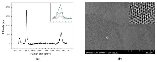 Characterization of graphene grown from coal tar at 500 °C: (a) Raman spectrum of graphene grown by coal tar at 500 °C (the upper right corner is the result of the fit of the Lorentz splitting of the 2D peak in the spectrum); (b) SEM of graphene grown by coal tar at 500 °C (the upper right corner is Graphene lattice image under spherical aberration microscope).