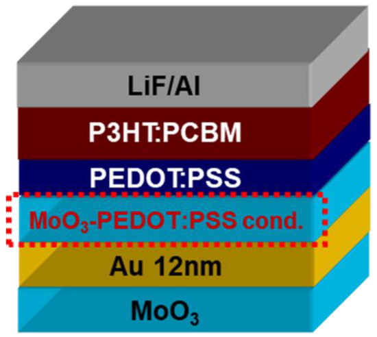 - Maniruzzaman, M.; Rahman, M.A.; Jeong, K.; Lee, J. MoO3/Au/MoO3–PEDOT: PSS multilayer electrodes for ITO-free organic solar cells. Mater. Sci. Semicond. Process. 2014, 27, 114–120. [Google Scholar] [CrossRef]