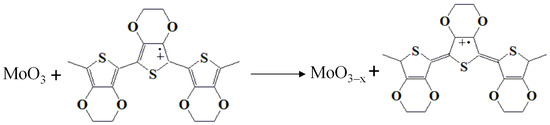 Conductive PEDOT:PSS polymer has positively charged PEDOT, and MoO3 has absolute electronegativity. In the composite of MoO3–PEDOT:PSS, Mo in MoO3 and S in PEDOT are bonded, and the resonant configuration of PEDOT chains transforms from a benzoid structure to a quinoid structure, as shown in Figure 2, which progresses the interconnection between the conducting PEDOT units. Therefore, this quinoid structure improves the conductivity of the composite of the MoO3–PEDOT:PSS layer [36]. An electrochromic composite film prepared by MoO3 and PEDOT:PSS both improve electron conduction, and increase ion transport, as well as ion diffusion by modifying the cumulative configuration of PEDOT. From our previous reports, this matches well with the existence of the Mo5+ valence electronic state formation from Mo6+ linked with the oxidation state of PEDOT [43], which suggests that there is a chemical reaction between the MoO3 and PEDOT chains. Meanwhile, charge transfer occurs between the MoO3 and PEDOT chains. The plausible reactions are shown below: