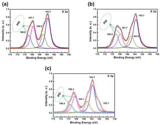 Figure 4a–c shows the raw peak, fitting peak, and the deconvoluted peak of the S 2p core level for the PEDOT:PSS on MoAuMo, MoAu-(Mo–PPSS) composite, and MoAu/Mo–PPSS conductive composite, respectively. The S 2p peak shows S 2p3/2 and S 2p1/2 spin-split doublet with 1.2 eV splitting energy, and thus these two peaks have a 1:2 intensity ratio [45,46]. The peaks involved at (163.7 and 164.7) eV of the S 2p contribution peaks belong to sulfur (S) atoms of the PEDOT, while the high binding energies peaks at (167.7 and 168.9) eV correspond to PSS. The PSS shows a higher binding energy than the PEDOT, due to the high electronegative oxygen attached to the S atom in the sulfonate fragment of the PSS. On the other hand, in Figure 4c, the intensity of the S 2P from the PSS moiety contribution remarkably decreases in contrast to the contribution from PEDOT, which increases compared to the other PEDOT:PSS on different electrodes. This indicates the quality control electrical contact film formed for PEDOT:PSS on the MoAu-(Mo–PPSS) conductive composite [47]. It has been recognized that the hygroscopic and highly acidic nature of PSS can easily absorb water, which results in the serious degradation of conductivity, as well as the stability of organic optoelectronics with PEDOT:PSS electrode devices [48,49]. The removal of insulating PSS from the upper part of the surface of the PEDOT:PSS grains and the crystallization of PEDOT lead to the establishment of highly conductive PEDOT-rich giant grains that enhance the transportation of charge carriers, as well as increase the photovoltaic device performance of the P3HT:PCBM photoactive layer cells by modifying the PEDOT:PSS layer [50].
