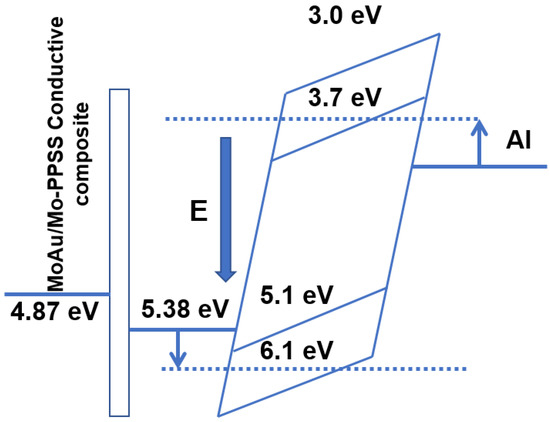 The work function is the representation of the energetic requirements for adding or withdrawing an electron from or to a solid for charge exchange. Hence, different electrodes’ work function were measured by utilizing Kelvin force microscopy (KFM) (Seiko, PA400, Japan). The conductive MoAu-(Mo–PPSS) composite electrode work function was measured at 4.87 eV, which is comparable with the reported ITO electrode value of 4.8 eV, as shown in Figure 6. The minimum adjustment of active components energy levels is essential for the MoAu-(Mo–PPSS) composite electrode in the replacement of the ITO anode in photovoltaic devices. Generally, low cation oxidation states have the effect of reducing the work function of an oxide [52]. In the case of the composite formation of Mo6+ being reduced to Mo5+, that is why the composite electrode WF decreases to 4.87 eV. Moreover, the WF of PEDOT:PSS HTL onto the composite was 5.38 eV, which aligns with that of the anode and the highest occupied orbital (HOMO) energy level of the absorber P3HT:PCBM, and hence, enhances the extraction of holes from the photoactive layer to the anode. This higher rate of charge transfer leads to lower recombination rates. Hence, overall device performance improves.