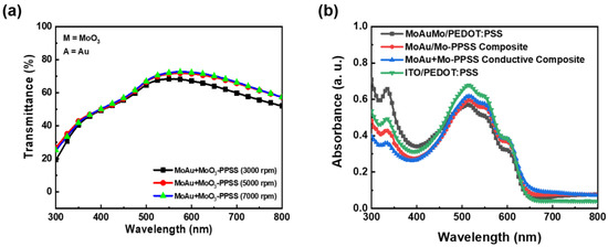 (a) Optical transmittances of Glass/MoO3 (30 nm)/Au (12 nm)/Mo–PPSS conductive composite, and (b) UV-Visible absorption spectra of P3HT:PCBM photoactive layer on different electrodes.